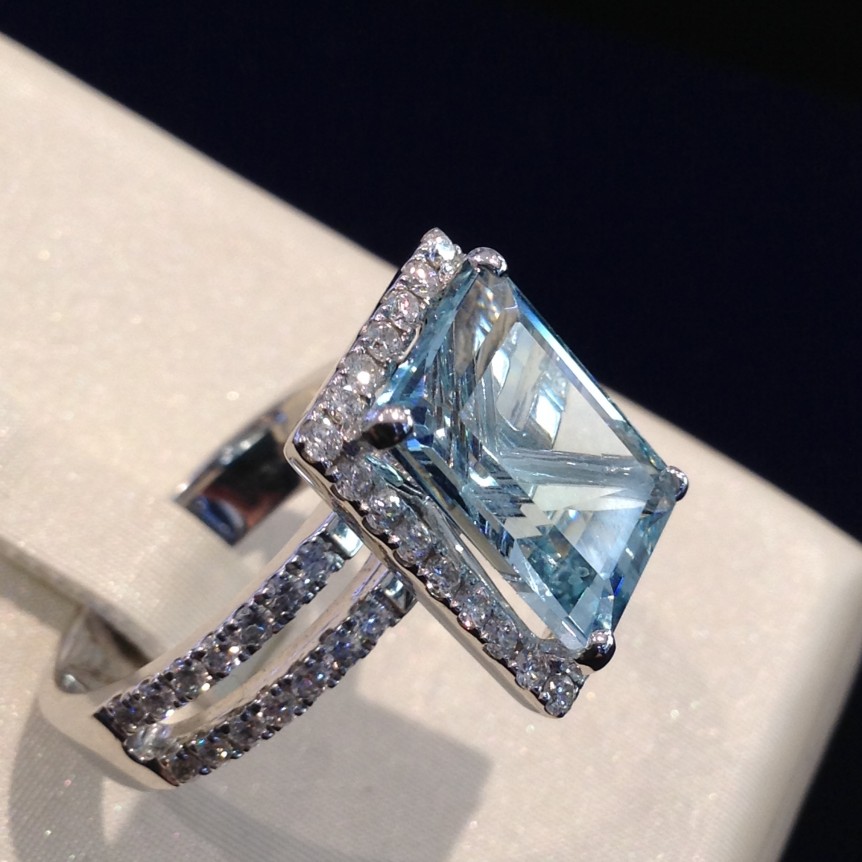 Celebrate life in style with this stunning aquamarine and diamond ring. The vibrant 4.71ct baguette cut aquamarine stone is claw-set and framed with round brilliant cut diamonds on a decadent mantle of beauty. Set on an exquisitely crafted double diamond 18k white gold band which creates the perfect balance to showcase this awe inspiring radiant design. This ring is truly a piece of captivating glamour designed for the woman who knows her worth.