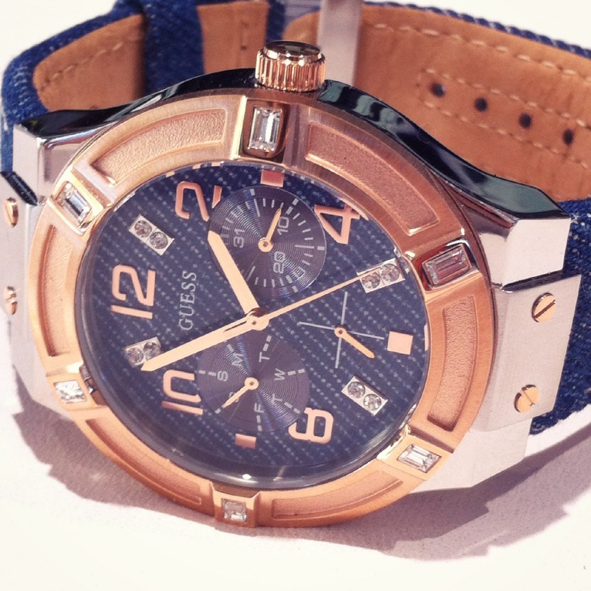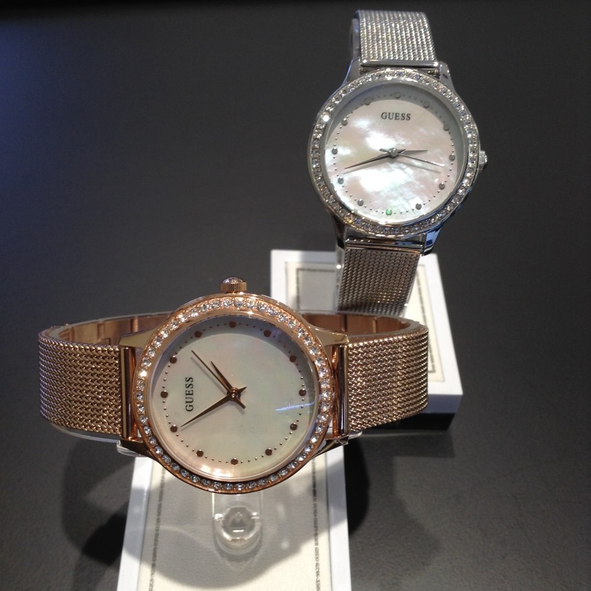 Read more... A stunning Chelsea timepiece by Guess featuring a round shaped mother of pearl dial with simple silver coloured indexes set within a polished silver or rose gold tone round case set with shimmering crystal stones and a mesh bracelet with adjustable g-links. Elegant, stylish and as always, fashion-forward design. ... Read More