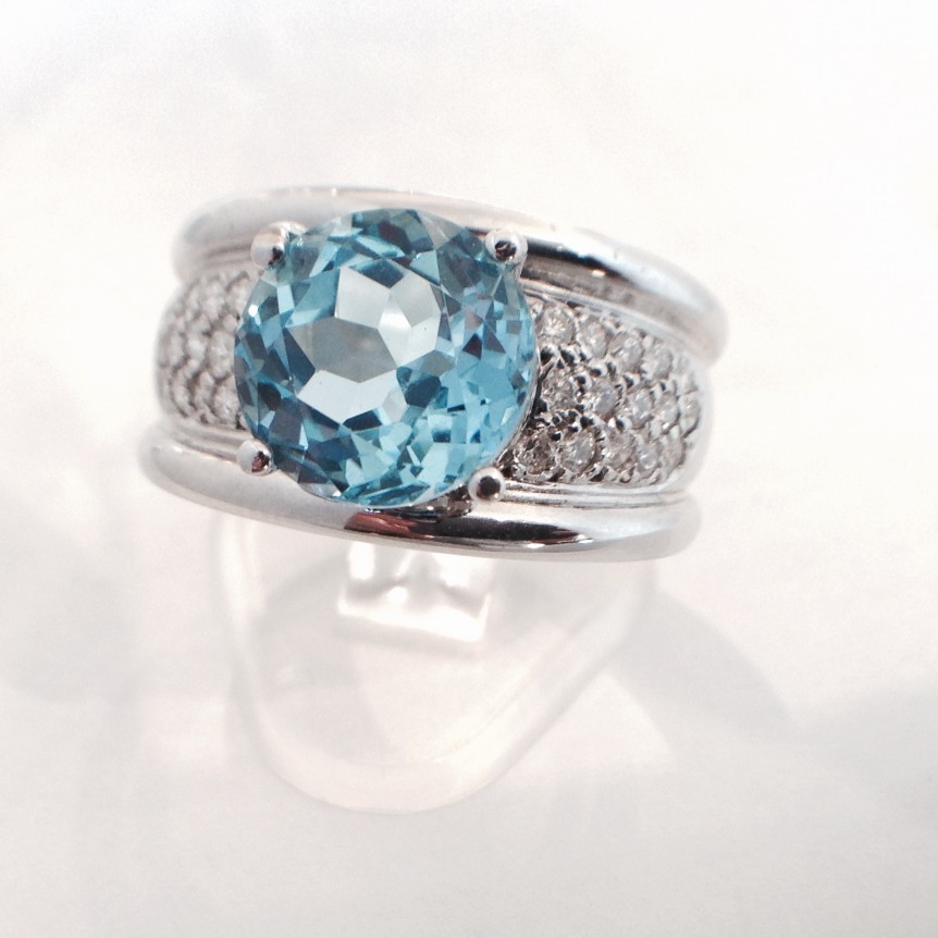 18K white gold dress ring with an topaz center stone and diamond shoulder stones.